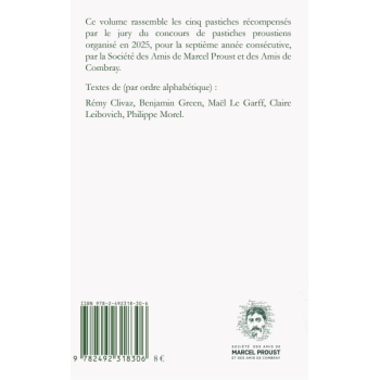 Ce volume rassemble les cinq pastiches récompensés et salués par le jury du concours de pastiches proustiens organisé en 2025, pour la septième année consécutive, par la Société des amis de Marcel Proust et des amis de Combray.